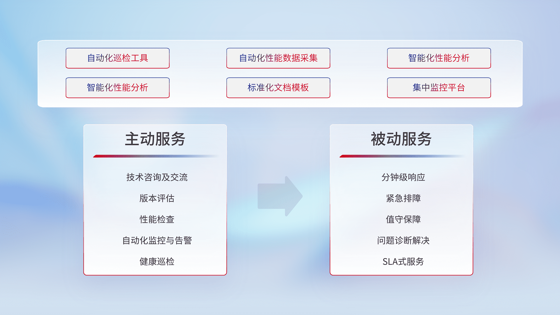 智能化工具和标准化文档,,,,保障服务质量,,提供主动服务(包含技术咨询、、版本评估、、、、性能检查、、自动化监控与告警、、、健康巡检)和被动服务包含(分钟级响应、、、、紧急排障、、值守保障、、、问题诊断解决、、、、SLA服务)。。